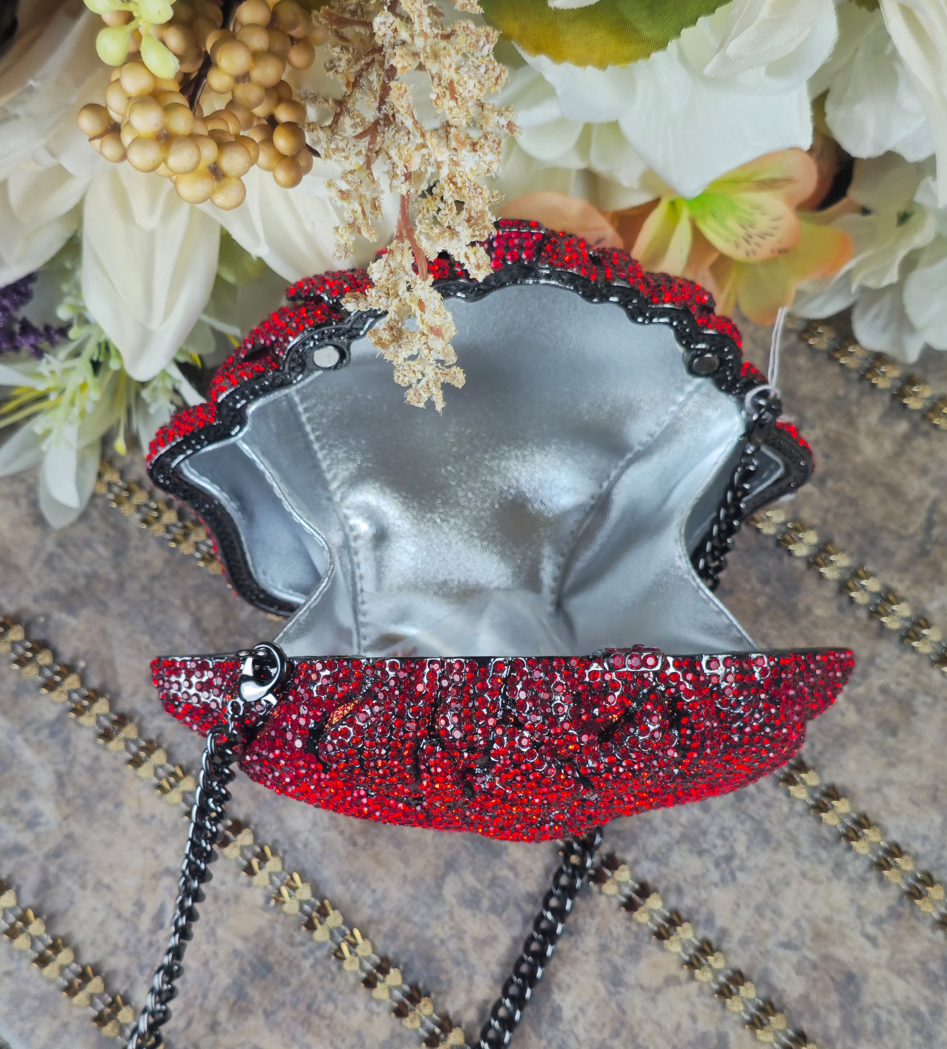 This rose-shaped clutch is a luxury accessory crafted with precision and elegance, featuring red and black rhinestones arranged in intricate petal detailing. Designed for formal occasions and statement fashion moments, it includes a secure clasp closure and a compact interior suitable for small essentials. Product images are for illustrative purposes only—actual colors and details may vary slightly due to lighting and screen settings. All product descriptions, images, and designs are protected by copyright and may not be reproduced without permission. Materials used are synthetic and non-toxic, and this item is intended for decorative and fashion use only. Please review our return policy and care instructions before purchase.